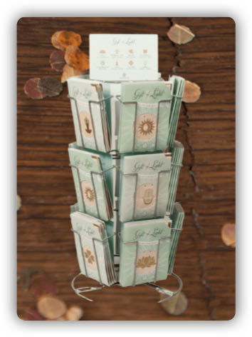 Deze compacte kaartenmolen die je gemakkelijk op een toonbank zet, biedt het complete assortiment Gift of Light-kaarten.